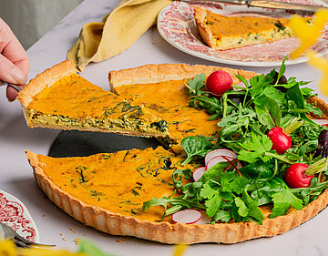 Die Füllung auf den Boden geben und glattstreichen und für 40-45 Minuten bei 180°C auf mittlerer Schiene backen, bis die Oberfläche leicht gebräunt ist. Die Quiche aus dem Ofen nehmen und 10–15 Minuten ruhen lassen, erst dann anschneiden.