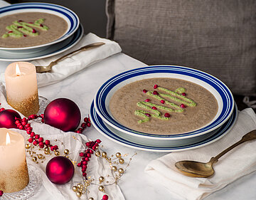 Die Suppe in Schalen oder Suppenteller füllen. Die Naturtofu-Creme in den Spritzbeutel füllen und in Tannenbaumform oder als Sterne auf die Suppe spritzen. Mit Granatapfelkernen als „Weihnachtskugeln“ garnieren und servieren.