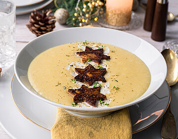 Für die Naturtofu-Croûtons den Naturtofu trocken tupfen, in ca. 0,5 cm dicke Scheiben schneiden und mit einem kleinen Sternausstecher Sterne ausstechen. Die Sojasoße, den Ahornsirup, das Paprikapulver und das Knoblauchpulver verrühren und die Sterne darin marinieren. Das Öl in einer Pfanne erhitzen und die Naturtofu-Sterne darin von beiden Seiten 4-6 Min. goldbraun braten.