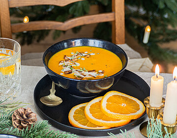 Suppe cremig pürieren, Kokosmilch und Ahornsirup einrühren. Mit Salz, Pfeffer und Orangensaft abschmecken.