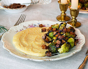 Cremige Polenta auf Tellern verteilen, gerösteten Rosenkohl und Tofu darüber geben. Optional mit etwas Balsamico-Creme toppen.