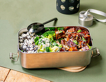 Für das Dressing Tahini, Zitronensaft und Wasser glattrühren, bis eine cremige, fließfähige Sauce entsteht. Mit Salz und Pfeffer abschmecken. Den Reis, den Brokkoli-Edamame-Mix und den glasierten Tofu nebeneinander in einer Bowl oder einer Meal-Prep-Box platzieren. Die Frühlingszwiebeln in feine Ringe schneiden und über die Bowl geben. Als Topping Hanfsamen und Sesam drüberstreuen und zum Schluss das Dressing über die Bowl geben.
