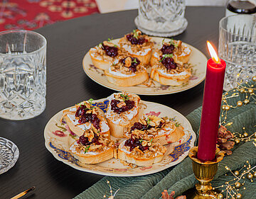 Crostini mit einer dünnen Schicht Frischkäse-Creme bestreichen. Etwas geraspelten Räuchertofu darauf geben. 1 TL Preiselbeer-Chutney darüber löffeln. Mit karamellisierten Walnüssen und etwas Thymian toppen.