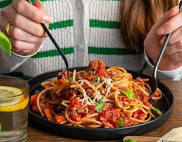 Die Zwiebel und den Knoblauch abziehen und fein würfeln. Die Möhren schälen und waschen. Den Sellerie waschen, putzen und mit den Möhren in Würfel schneiden. Öl in einer Pfanne kurz erhitzen. Berief Bio veganes Hack ca. 3 Min. anbraten. Die Zwiebel und den Knoblauch zufügen und kurz mit anbraten. Die Möhren und den Sellerie dazugeben und andünsten.