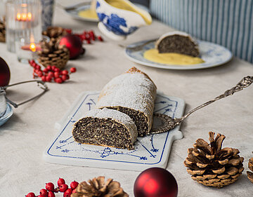 Backofen auf 180 °C (Ober-/Unterhitze) vorheizen. Strudelteig ausrollen, Mohn-Tofu-Masse gleichmäßig darauf verteilen, rundherum 2 cm Rand lassen. Strudel vorsichtig einrollen, mit der Naht nach unten auf ein Backblech legen.